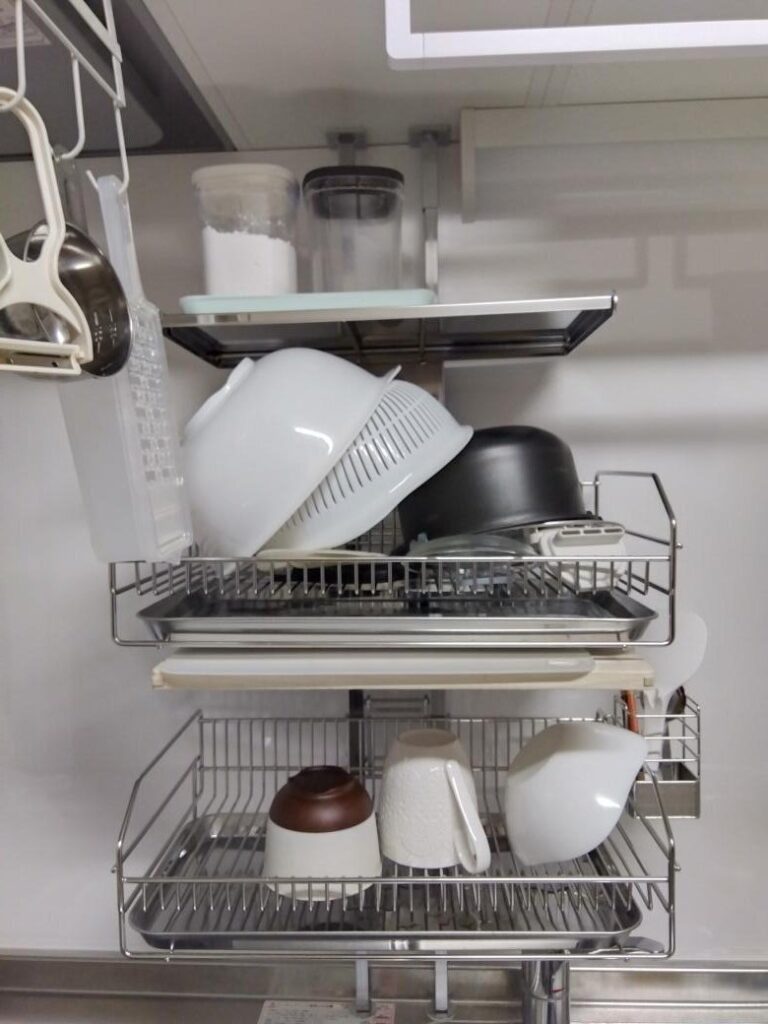ウチは縦幅が短いので「食器2段+調味料」で限界でしたが、縦幅があるおうちは食器3段タイプもイケるそうな!