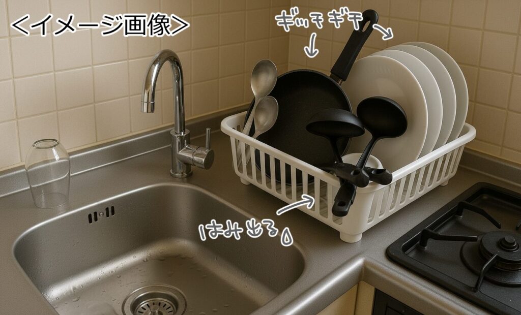 シンクも広くないし、水切りカゴには全部入らないよ…